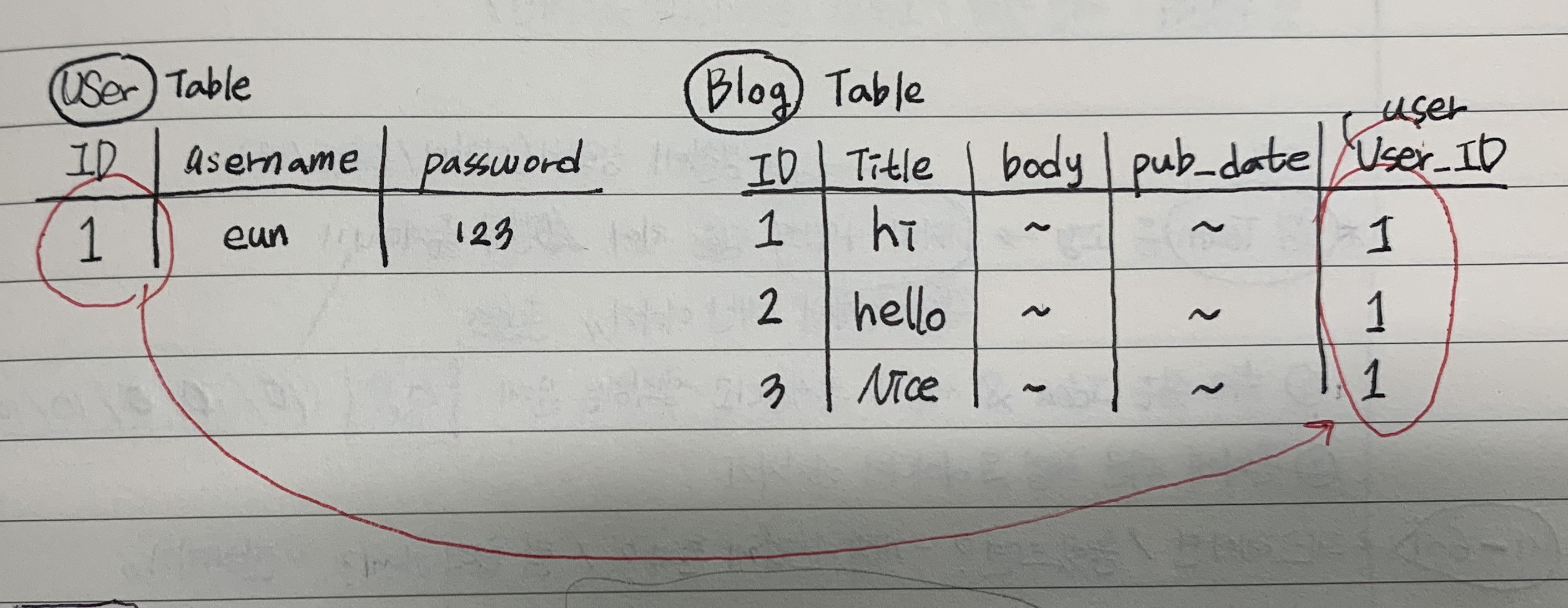 이런 경우, user model과 blog model의 관계는 1:n관계인 것을 확인 할 수 있습니다.
